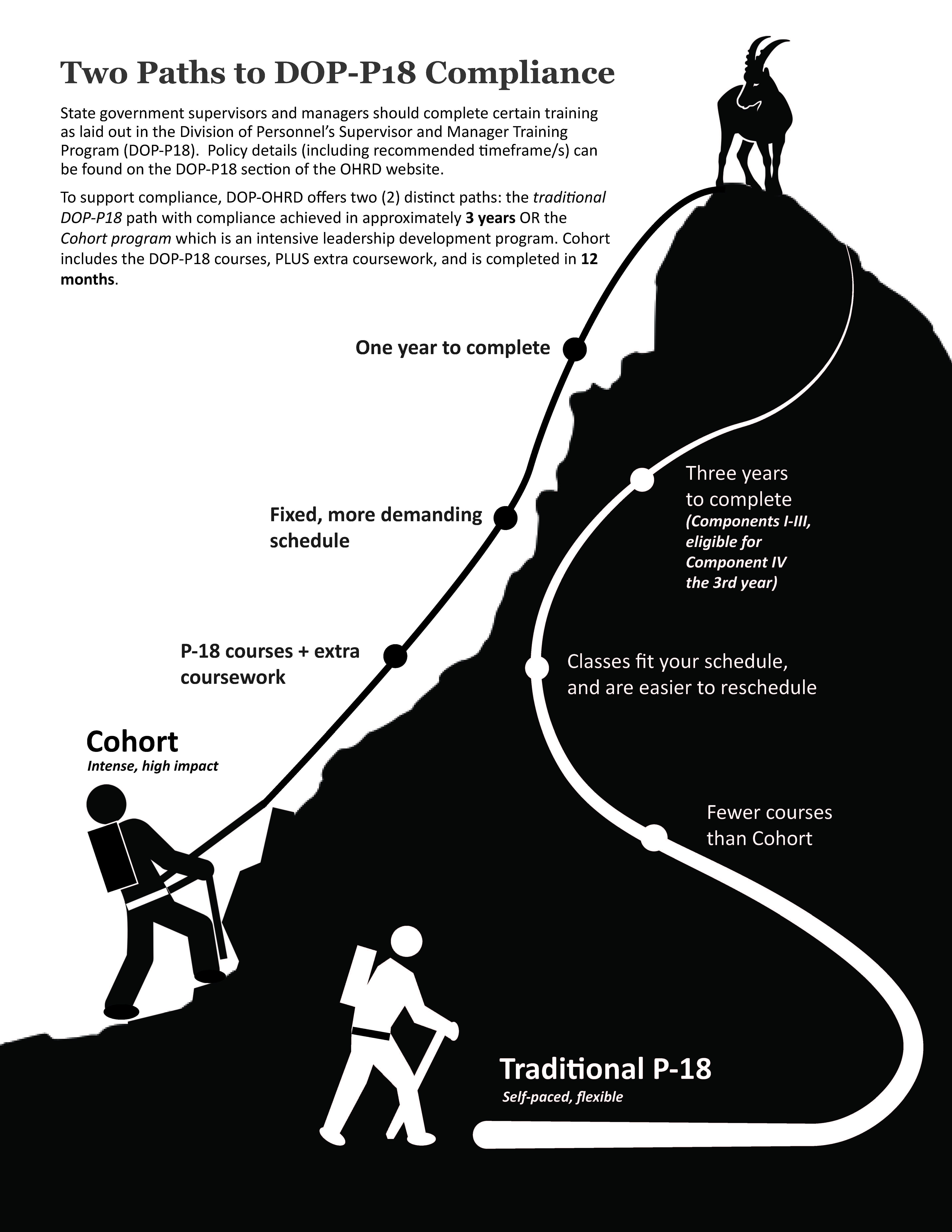 While mangers/supervisors can independently complete the courses below to achieve compliance, the Division of Personnel offers a dedicated cohort where participants completes all requirements over the course of one calendar year. For additional information on the Cohort Program, click here or email dop.registrar@wv.gov.