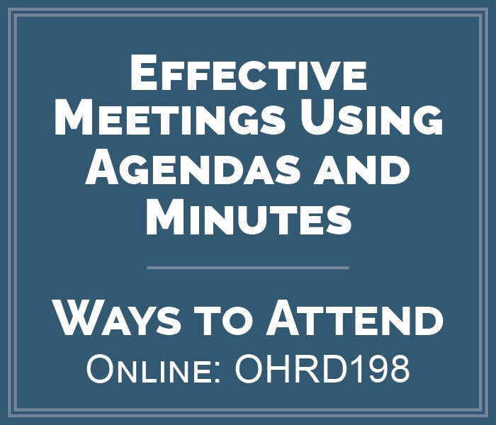 Effective Meetings Using Agendas and Minutes is an online class that introduces fundamental tools for meeting success. The class uses a WebQuest approach whereby the learner explores web-curated content and must successfully complete an activity.