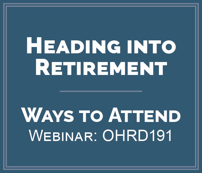 This multi-day, virtual training series is designed to provide you with information to help you make informed decisions about your retirement plans. Employees who are contemplating retirement (in the next 5 years) and are 50 years of age or older will gain the most benefit from Heading into Retirement: Planning for a Secure Future.